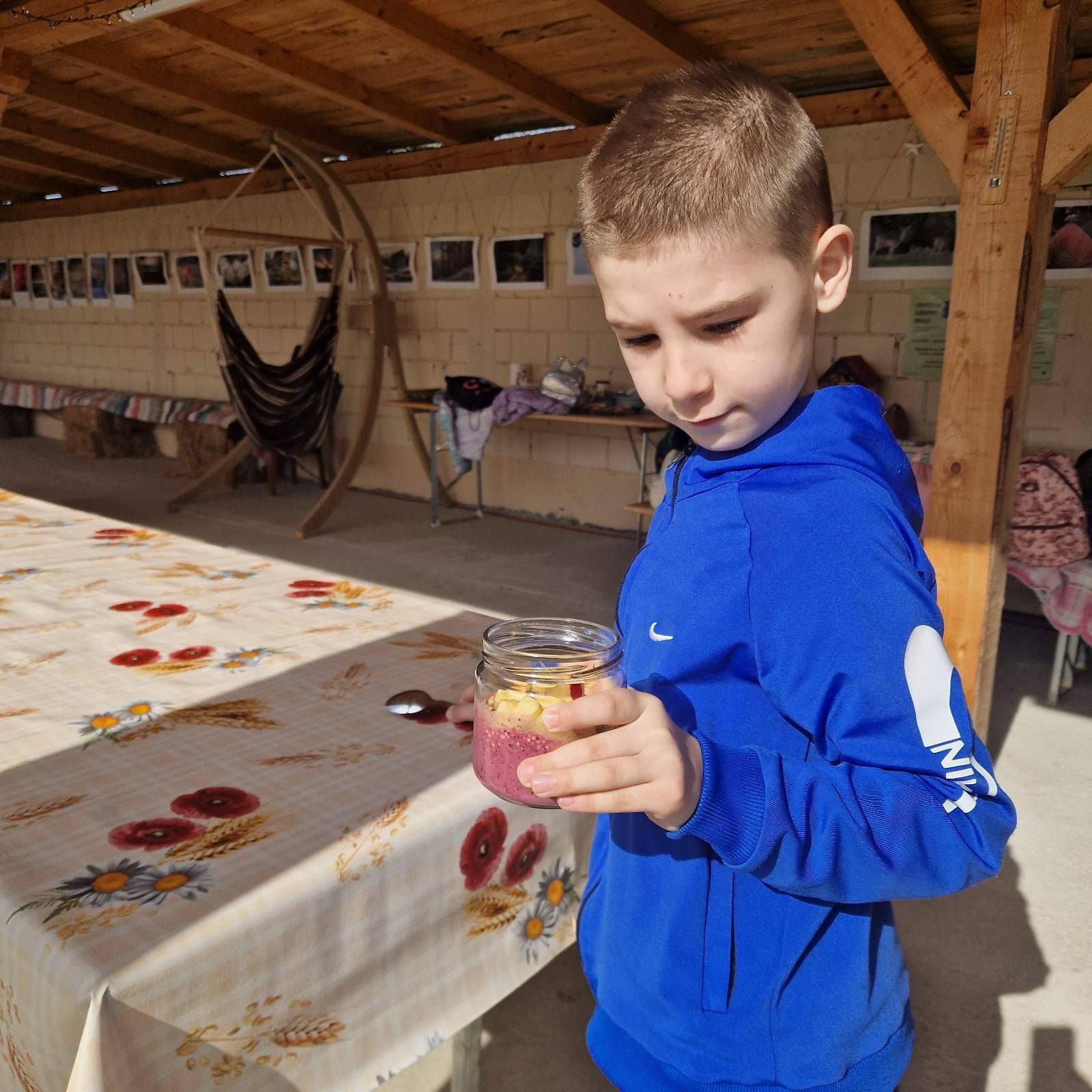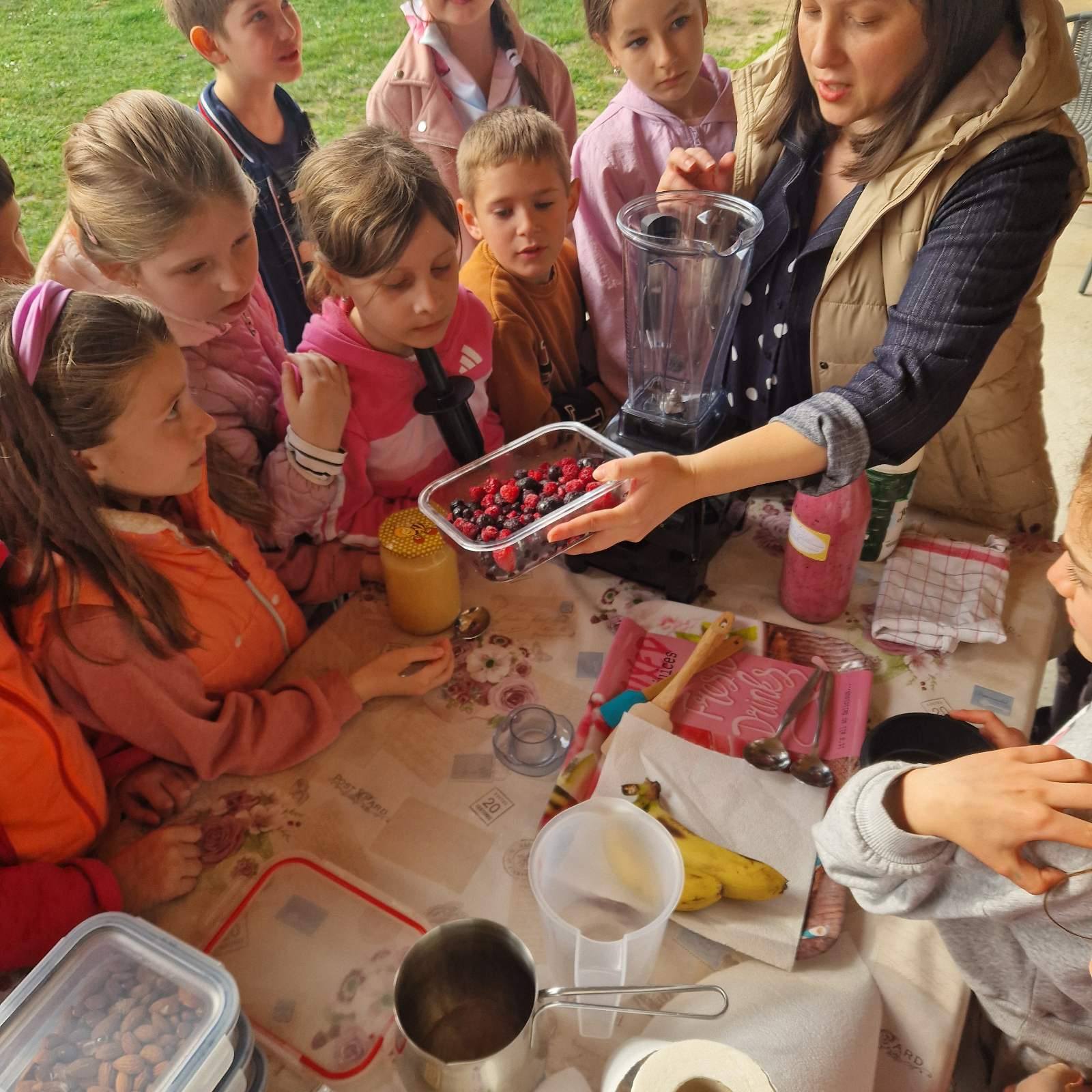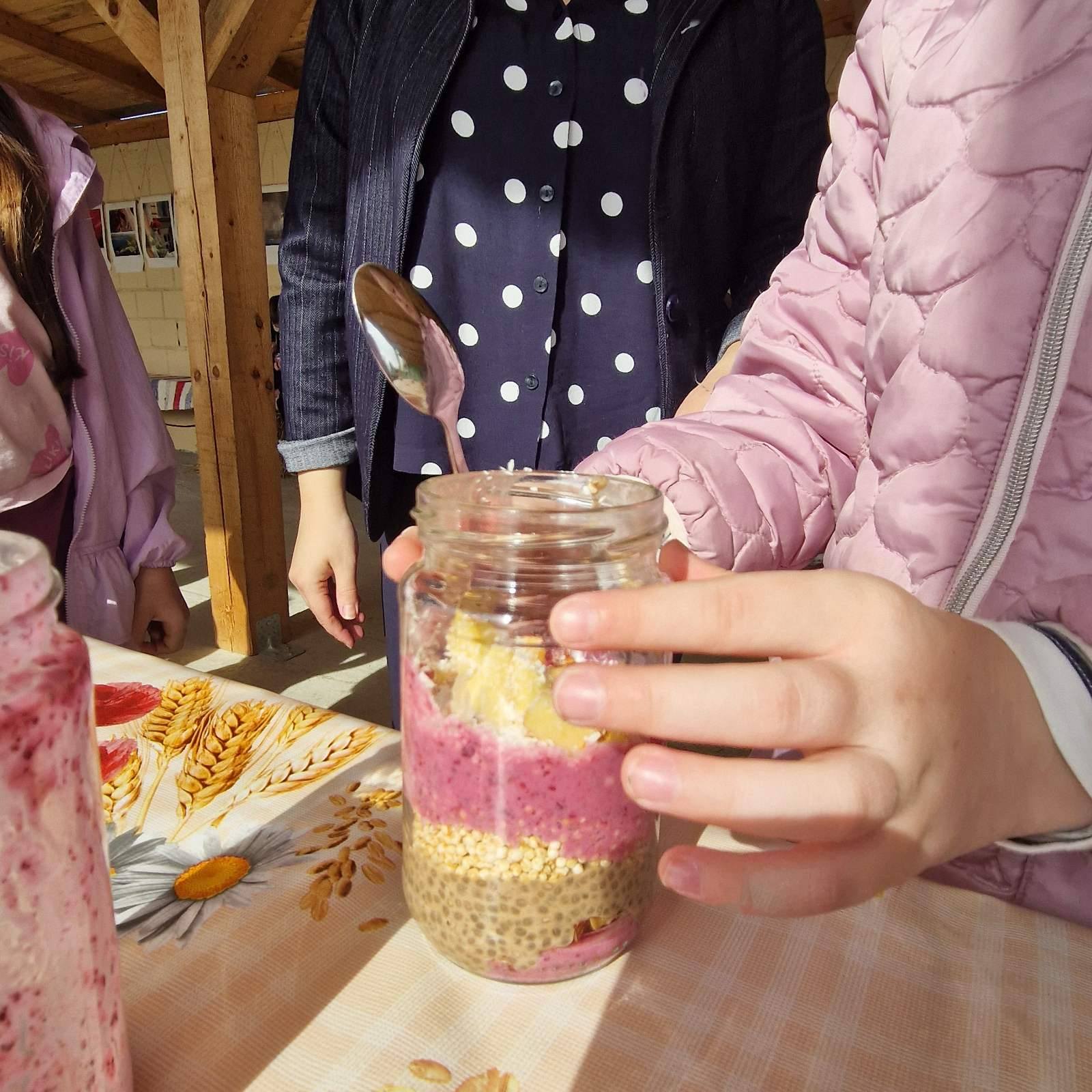 During the first workshop, students became familiar with healthy ingredients that can be used to prepare a delicious and nutritious dessert as well as a healthy breakfast. They discussed the ingredients of granola, learned what chia pudding can contain, and together prepared homemade fruit yogurt with berries and honey. The students showed great interest in recognizing the berries and nuts used in granola.