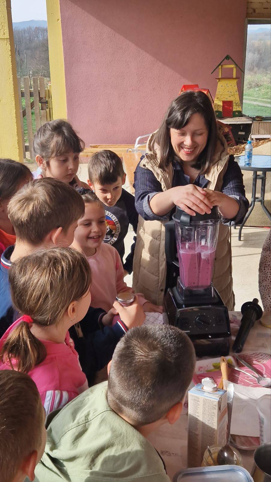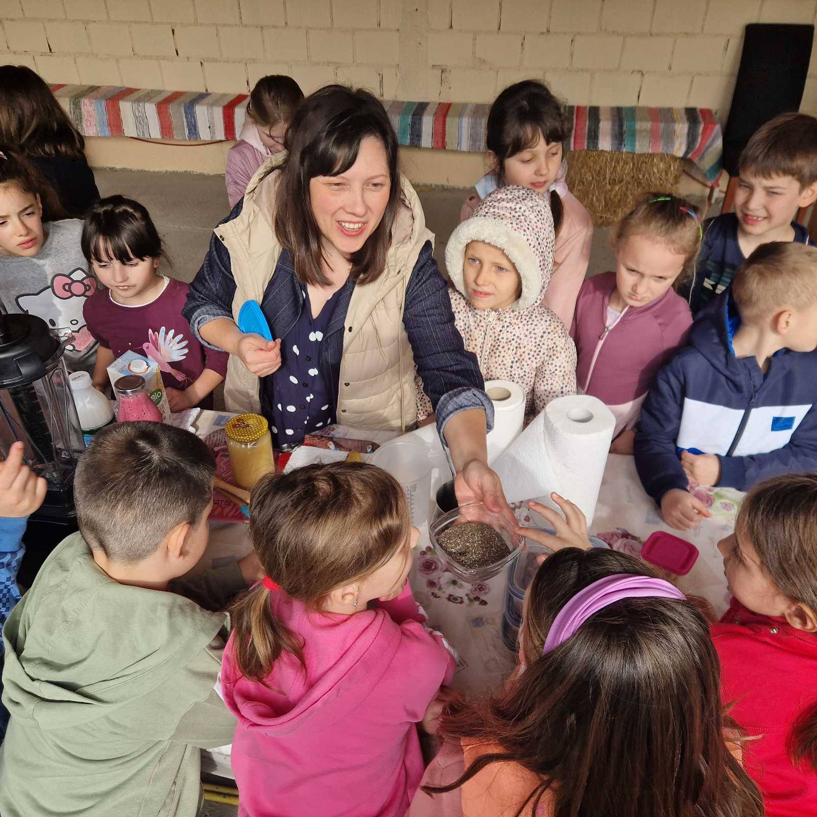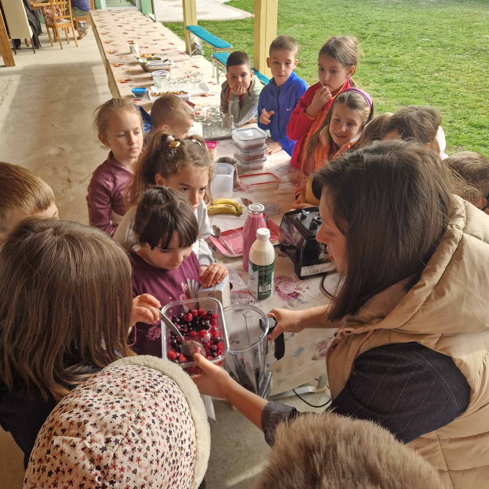During the first workshop, students became familiar with healthy ingredients that can be used to prepare a delicious and nutritious dessert as well as a healthy breakfast. They discussed the ingredients of granola, learned what chia pudding can contain, and together prepared homemade fruit yogurt with berries and honey. The students showed great interest in recognizing the berries and nuts used in granola.